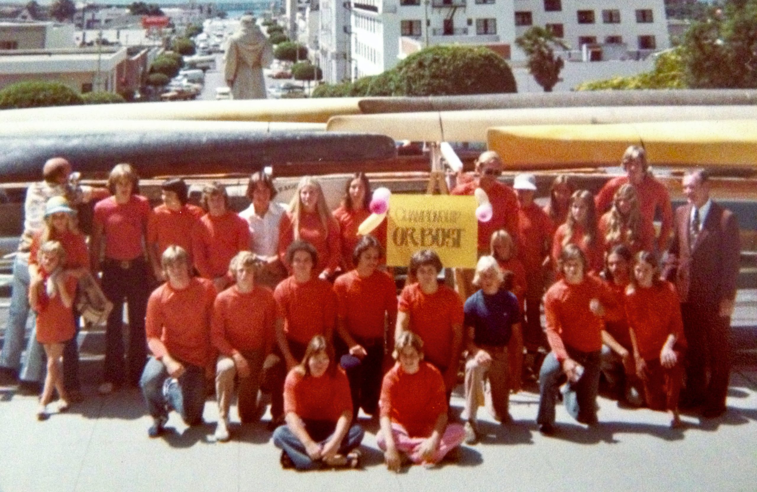 Coach Bragg was a teacher at Balboa Junior High School (now Balboa Middle School), teaching PE and math there for many years. This gave Coach a great venue from which to recruit athletes for his club. Towing a 40-foot boat trailer (built as a welding project for a class at Ventura College), he’d drive his van and this trailer loaded with all kinds of canoes and kayaks to the Ventura Harbor each morning. There, dozens of kids ages 12 to 18 and a few adults would gather to paddle doing the workouts Coach prescribed. Most clubs in America had birds for mascots – Coach Bragg chose the Turkey for our club and a parent created our classic turkey logo in 1977.